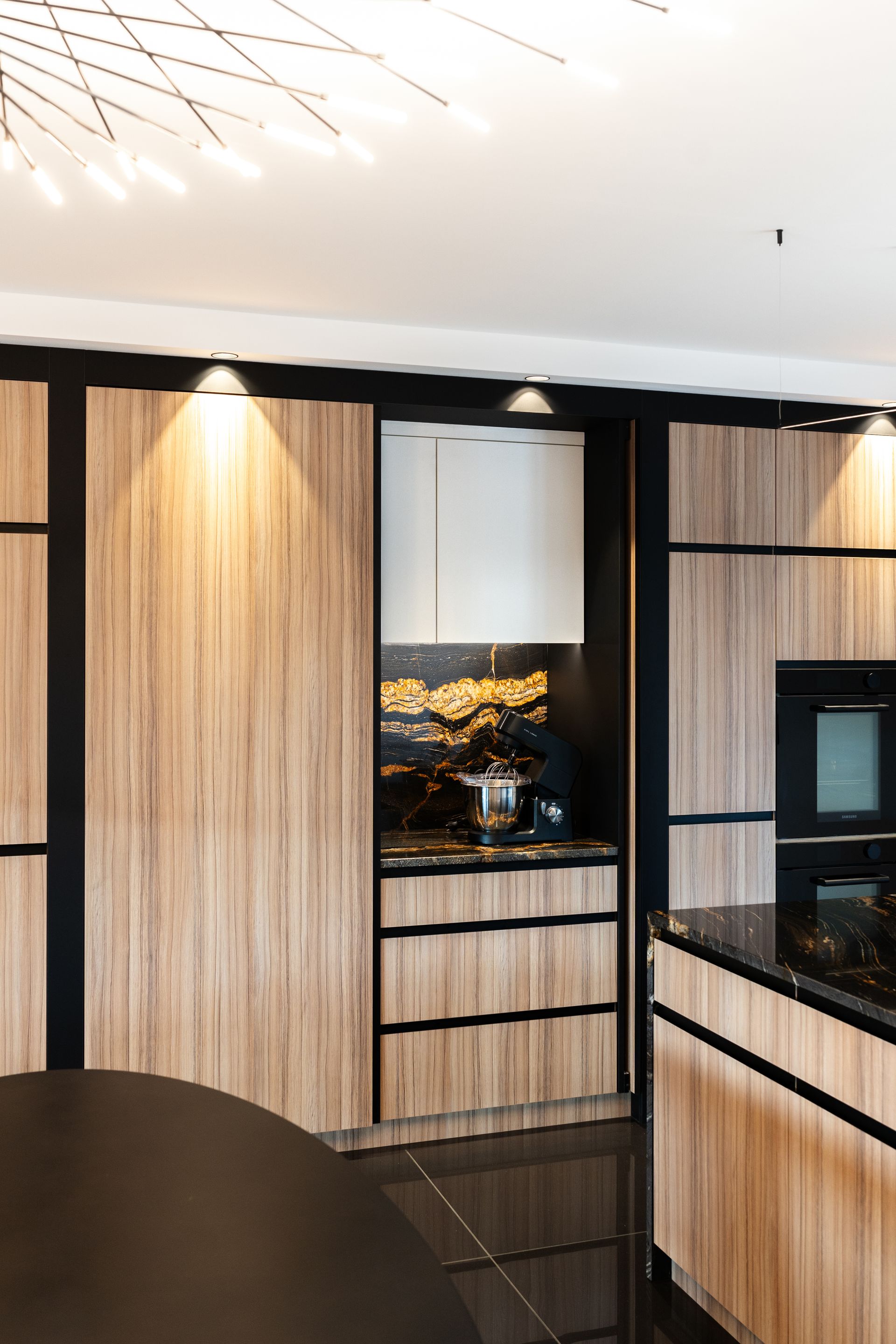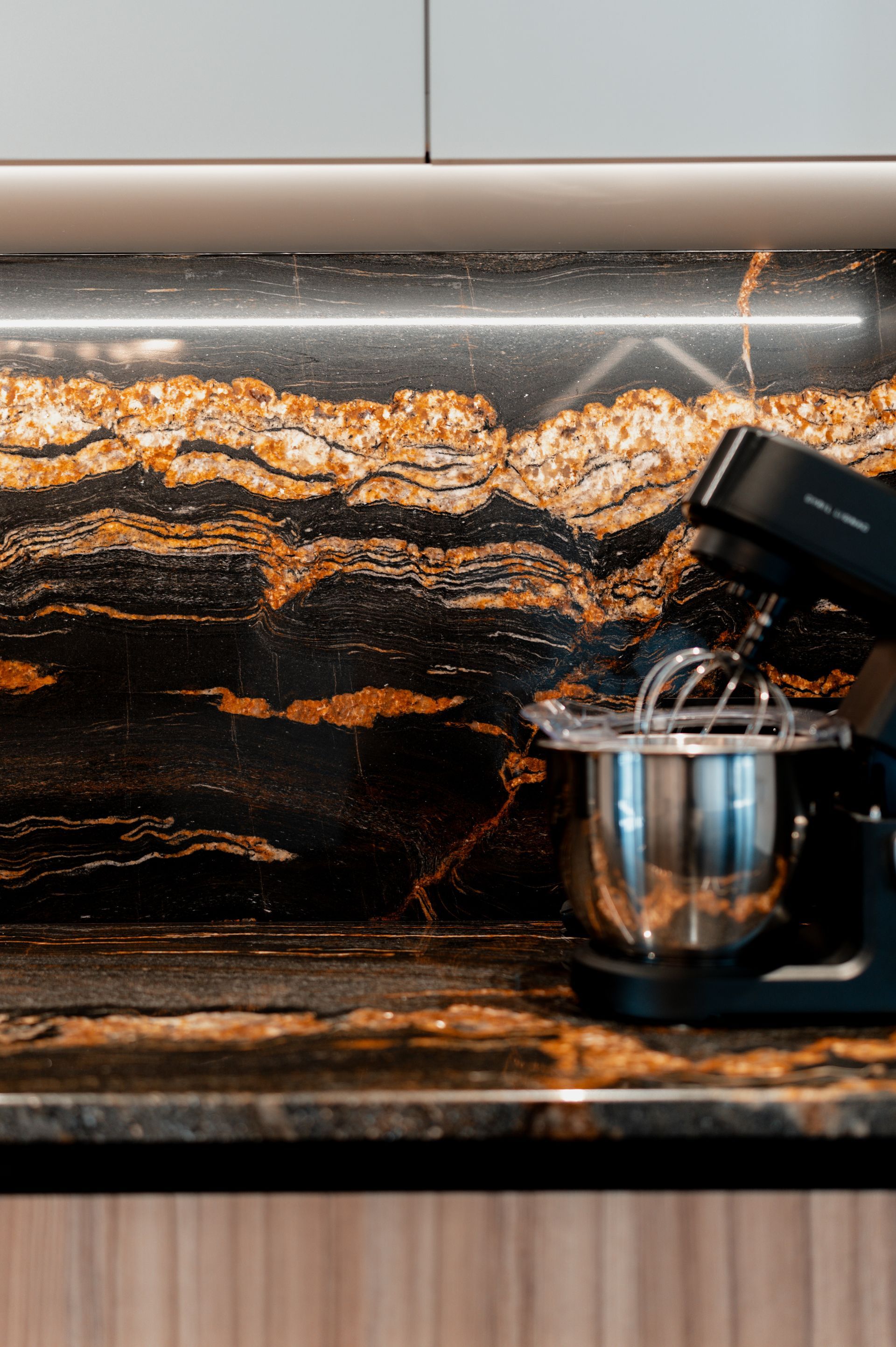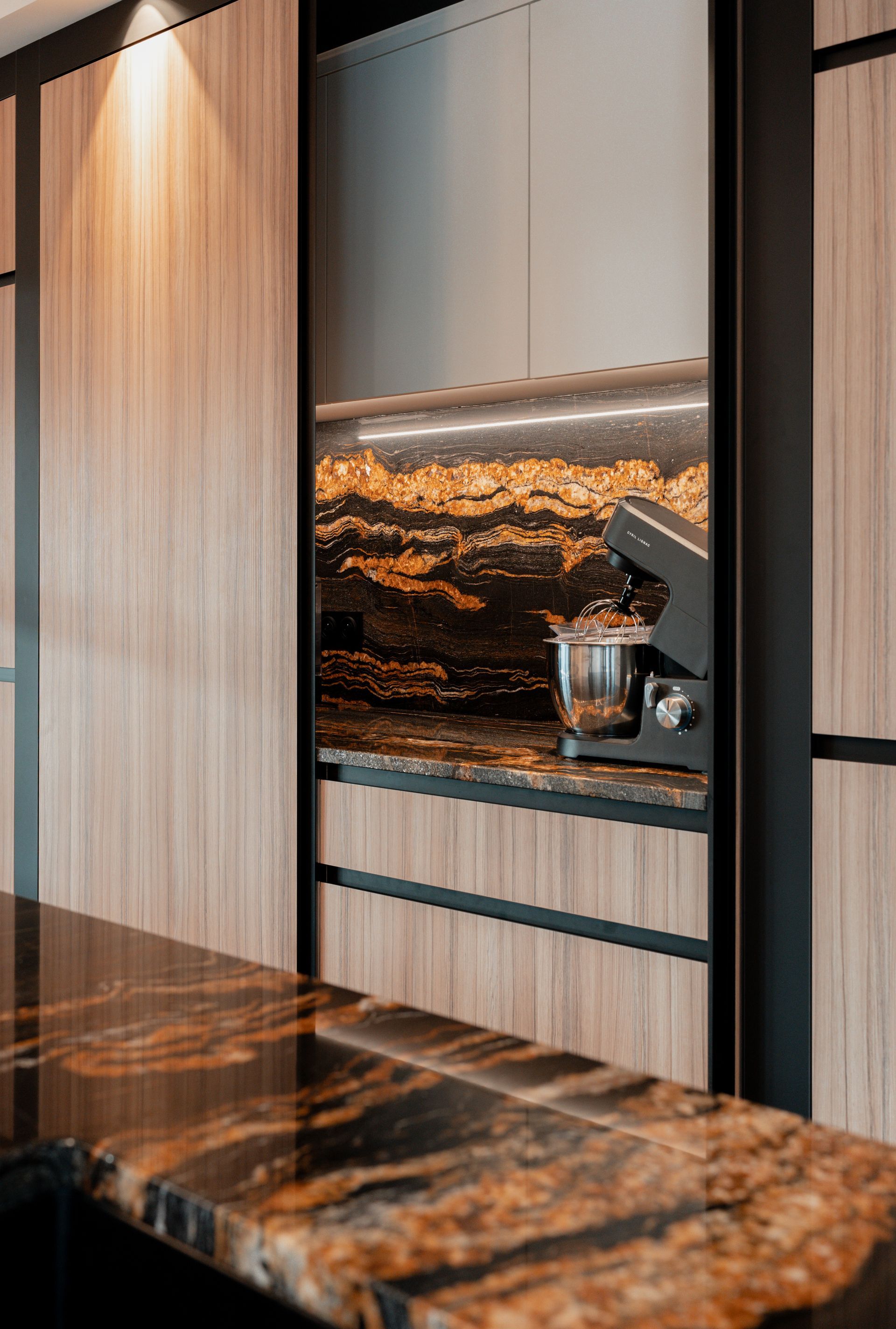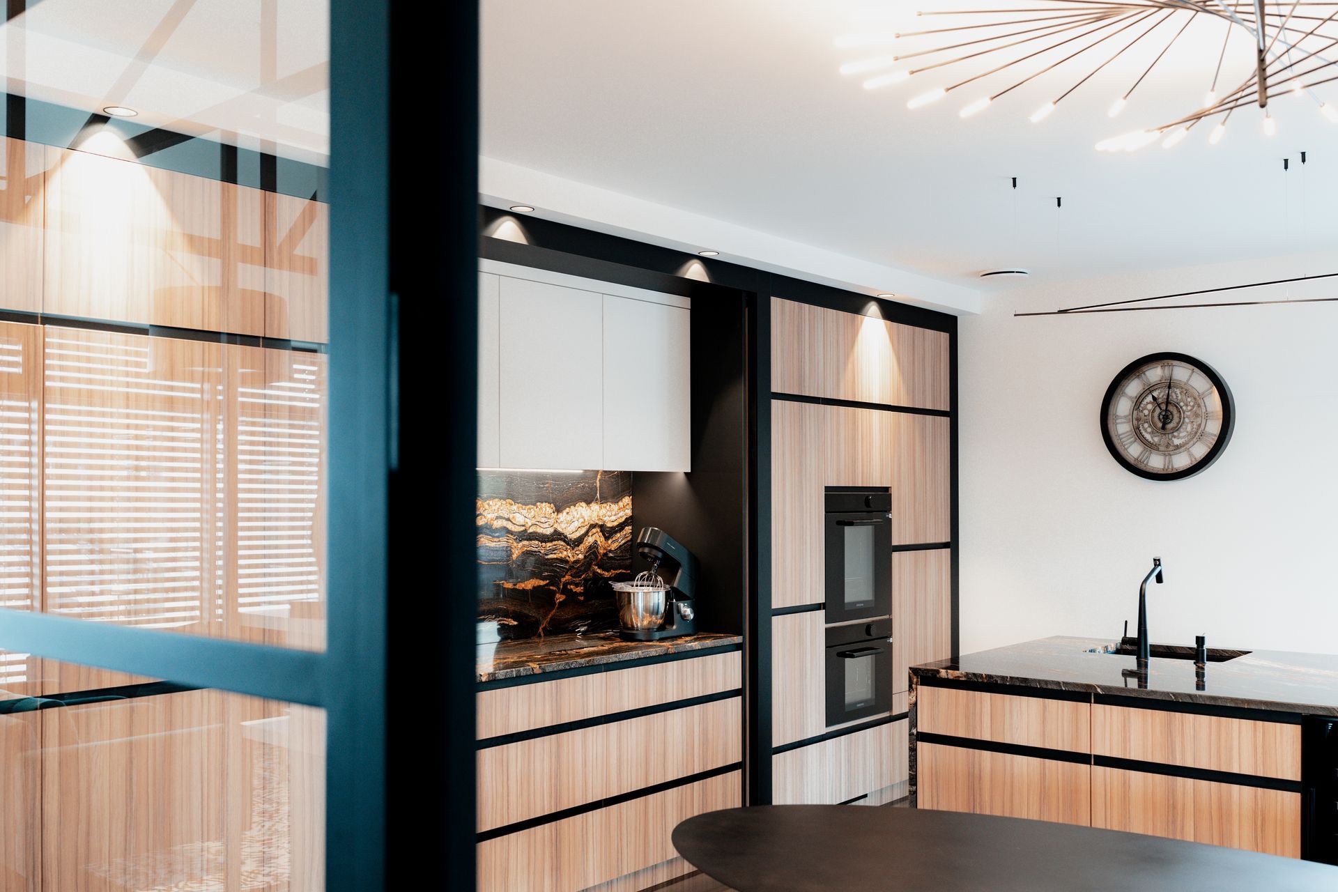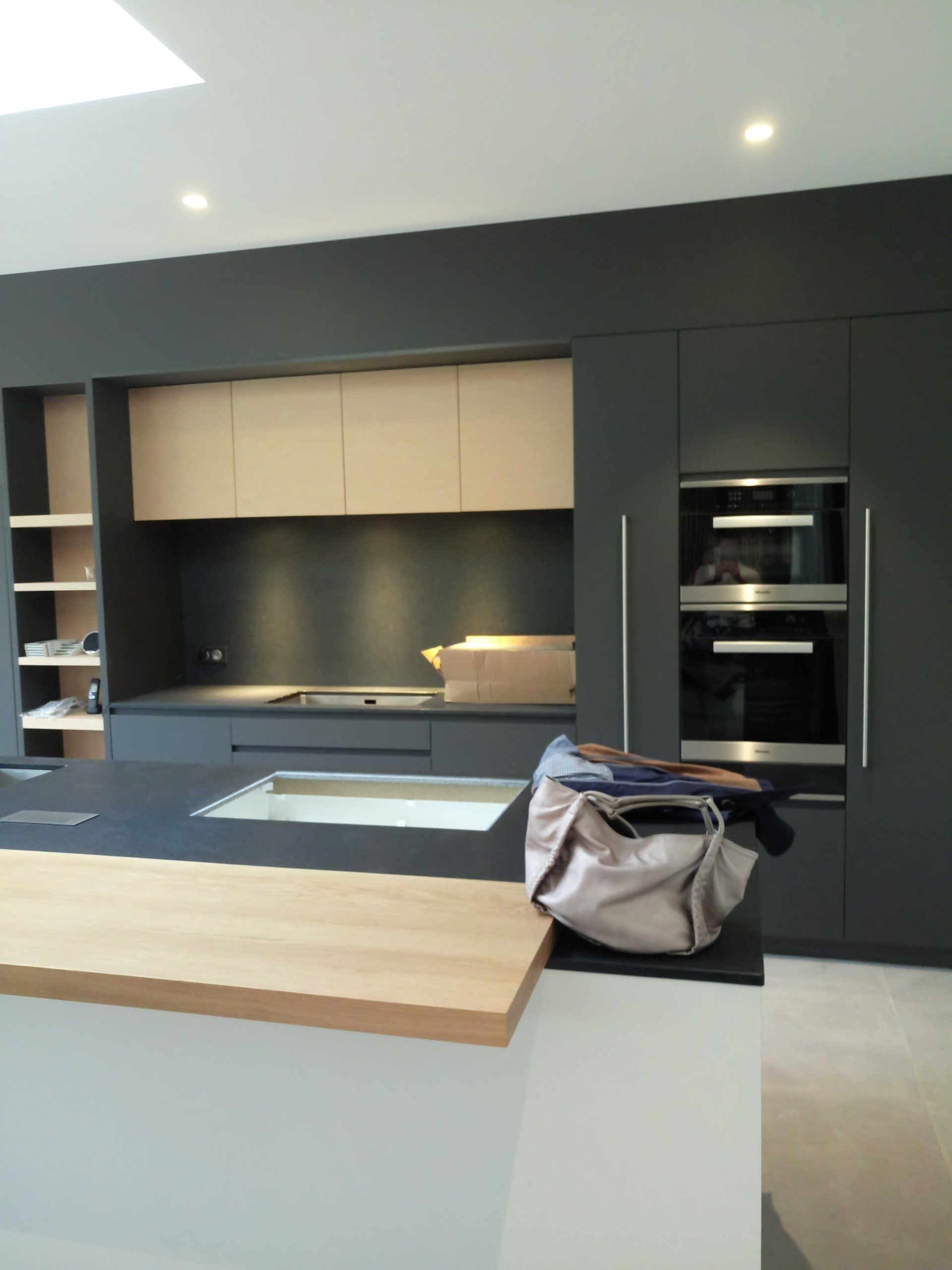 Partie 1 : LA CUISINE, façade réf "coco bolo" de chez Egger, poignées profil noir, plan de travail et crédence incroyable "granit black fusion" en provenance d'Italie façonné par #arconit Saint Berthevin